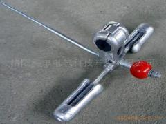 警告!无授权使用我公司版权产品内容和图片,将追究法律责任! 所属技术领域: 本实用新型涉及一种高压输电线路均压先导防绕击避雷针装置,尤其是能提高避雷线对输电导线屏蔽的保护范围,补充避雷线屏蔽雷电的不足,雷电通流能力增强,使雷电迎面先导入避雷针,从而更加有效保护高压输电线路免遭雷击。 技术背景: 目前,输电线路上已经安装的防绕击避雷针和避雷器等避雷装置,屏蔽保护范围小,通流能力低,绕击雷电现象仍然存在,其弊端是单相避雷线安装,或者单一安装在铁塔上,屏蔽保护范围有限,雷电绕击导线漏洞仍然很大,因此,设计开发更为有效的防绕击避雷针迫在眉睫。本实用新型是一种能够在高压输电线路的两条避雷线上,横担安装的均压先导防绕击避雷针,尤其是更容易获得较大的屏蔽保护范围,通流能力增强,根据输电线路的不同架设方式、电压等级,加长针杆,可以获得更大的屏蔽保护范围,屏蔽保护效果大大提升。它包括连接紧固于两条避雷线的丁字型线夹、横担针杆、两个垂直向上均压环先导针杆和两个仰角边侧均压环先导针杆通过两个丁字型线夹分别紧固于两条避雷线上构成一体,形成先导均压防绕击避雷针装置。本实用新型以现代防雷理论和技术依托,利用针尖容易产生雷电迎面先导的机理,旨在有效地将雷电绕击高压输电导线,转化为迎面先导避雷针后传入接地线来加以控制,从而有效地防止雷电绕击导线,大幅度的降低雷击故障跳闸率,降低超高压和特高压线路的雷击闪络事故,确保电网安全运行,同时也可避免雷电流直接击中避雷线或OPGW光缆,引起断线断股事故;尤其是两条避雷线有横担杆相连紧固,抗风舞动性能大大提升,从而降低了避雷线和金具线夹之间的磨损,避免避雷线断裂的发生。本实用新型容易制造生产,也便于安装施工。 为了克服现有的防绕击避雷针只能单相安装、屏蔽保护范围小,通流能力小,抗风舞动能力的不足, 本实用新型提供一种高压输电线路均压先导防绕击避雷针装置,该装置不仅能提高避雷线抗雷电防绕击导线的屏蔽保护范围,通流能力增强,而且能更好的提高避雷线的抗风舞动能力,避免避雷线断裂发生,提高避雷线的使用寿命。 本实用新型解决其技术问题所采用的技术方案是: 在两条避雷线上横担架设均压先导防绕击避雷针,它包括紧固于两条避雷线的丁字型线夹、横担针杆、两个垂直向上均压环先导针杆和两个仰角边侧均压环先导针杆,两个垂直向上均压环先导针杆和两个仰角边侧均压环先导针杆通过两个丁字型线夹分别紧固于两条避雷线上构成一体,形成均压先导防绕击避雷针,并可随着输电线路的不同架设方式和避雷线之间的间距大小,方便调节制作出屏蔽保护范围更大的均压先导防绕击避雷针装置。可以安装在杆塔本身顶端,或杆塔两边方向避雷线的15米、30米、50米处,形成完整的避雷均压屏蔽保护网系统。 本实用新型的有益效果:1、优点:可以在两条避雷线横担架设均压先导防绕击避雷针,2、由此必然产生的技术效果是:两个垂直向上均压环先导针杆和两个仰角边侧均压环先导针杆屏蔽保护范围增大,独特的丁字型线夹设计更加牢固,通流能力增强,避雷线抗风舞动效果显著,结构新颖美观,安装方便,结构简单。 下面结合附图和实施例对本实用新型进一步说明。 具体实施方式: 1、安装步骤: 1、安装前高空作业人员要办理工作票手续,履行许可手续后,监督员监督无误,方可开展现场作业;2、高空作业人员沿地线飞车(或OPGW光缆飞车)先到达50米处安装第一组,安装时一定要做好人身安全防护措施;3、再返回30米处安装第二组,4、再次返回15米处安装第三组,5、最后返回铁塔,不用横担针杆分别安装铁塔羊角处两个均压先导防绕击避雷针即可。 2、适用范围和安装位置: 高压输电线路均压先导防绕击避雷针装置在架空避雷线上距铁塔横担中心两边15m、30m、50m各装一个,每基塔装八个。铁塔头有高压输电线路均压先导防绕击避雷针的配套金具,每基塔装二个。它在铁塔羊角靠最上侧和最外侧的螺栓上水平安装,针杆上扬,并至少伸出羊角外600mm。按不同型号可适用于110kV~500kV直至1000kV、±800 kV等交、直流输电线路架空地线,截面在35~250mm2 钢绞线,铝包钢绞线,良导体绞线,OPGW光纤复合架空地线等。 | |