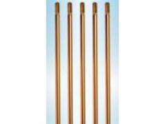 铜包钢接地棒是用特殊的电铸技术将99.9%的纯铜均匀覆盖到低碳钢芯上,使铜与钢芯完全分子结合(如两者结合不密,在通电的情况下,会产生原电池反应,阳极金属铁发生氧化反应变成铁离子流失,反而加快钢芯受蚀)。它具有铜层厚(0.25毫米以上)、粘合度好、不剥离(可轧制螺纹)等特点。它的优点是抗拉强度大(高大600牛顿/平方毫米),耐腐蚀性强(可保证使用寿命在50年以上),有恒定的低电阻及良好的可塑性,既有与铜等同的性能又兼有钢材特性。 铸铜包钢接地棒,深埋地下后无论是自然腐蚀还是电化学反应,都有极强的保护性。接地棒与接地连线采用我公司生产的焊粉进行放热焊接,使接地装置完全处在铜的保护之下,成为真正的免维护接地装置。铜包钢接地棒配有同轴连接器、驱动头和钻头等配套件。根据不同地质及使用要求可以通过采用黄铜同轴连接器(连接螺栓)连接,任意增加铸铜接地棒的长度。项端采用驱动头(连接螺栓)连接,供棒打深时打击使用。末端采用特制钻头(连接螺栓)连接,以便于将棒打深。二.技术优势 1制造工艺先进;采用国内最新的电镀法技术生产,弯曲180度不会出现脱节、翘皮、开裂现象。 2防腐特性优越;表面铜层较厚(平均厚度大于0.25mm),耐腐蚀性强,使用寿命长(大于30年),减轻检修劳动强度。 3电气性能更佳;表层紫铜材料优良的导电性,使其自身电阻值远低于常规材料。4广泛实用性;该产品适用于不同的土壤湿度、温度、PH值极电阻率变化条件下的接地建造。 5连接安全可靠;使用专用连接管或采用放热焊接,接头牢固,稳定性好。 6安装方便快捷,配件齐全,安装便捷,可有效地提高施工速度。 7提高接地深度;特殊的连接传动方式,可深入地下35米,以满足特殊场合低阻值要求。8建造成本低,对比传统纯铜接地棒,接地带的建造方式,成本大幅度降低。三.产品型号