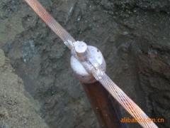 接地系统的放热焊接施工工艺放热焊接是一种简单、高效率、高质量的金属连接工艺。主要用于铁路、高速公路发电厂、变电站、开关站、高压输电线路、电气化铁路、电信、移动通信基站、微波中继站、地面卫星接受站、雷达站等重点工程以及贵重精密仪器、计算机机房设备、邮电程控设备、广播电视设备、电子医疗设备等工作接地和保护接地;石油输送管道及油气罐,易燃易爆物质仓库防雷接地。1.工艺原理(1)放热焊接是通过铝与氧化铜的化学反应(放热反应)产生液态高温铜液和氧化铝的残渣,并利用放热反应所产生的高温来实现高性能电气熔接的现代焊接工艺。放热焊接适用于铜、铜和铁及铁合金等同种或异种材料间的电气连接,它无需任何外加的能源或动力。(2)反应式:3Cu2O+Al┄┄>6Cu+Al2O3+热量(温度可达 2537℃以上)2、工艺流程被焊接物敷设----选择模具-----焊接准备-----焊接物就位-------放置钢盘---------加入反应粉末------点火器点火-----焊 接-------清洁模具3、操作要点(1) 被焊接物按照设计要求敷设到位后,在需要焊接的部位进行放热性焊接。(2) 选择模具摸夹及工具1) 模具模具采用石墨制成,是一个石墨坩埚(见下图),由于石墨较脆弱,无法承受抛甩与强力冲击,故不可将超出模局具铭牌所示尺寸的熔接物强行放入模具墨制成,较较脆弱,无法承受抛甩与强力冲击,故不可将超出模局具铭牌所示尺寸的熔接物强行放入模具,或使用金属物质、坚硬的工具等来清除残渣。放热焊接的安全防护:1)放热焊接方式会产生高温,不可避免地有金属颗粒逸出,而造成对施工人员身体的伤害。在使用放热焊接的过程中,一方面应该采用低烟配方,从根本上减少金属颗粒逸出的;另一方面应该加强对施工人员的保护,加强通风,戴好口罩,防止施工人员金属中毒。2) 施工操作时,现场 1.50米之内,不得有无关人员停留。3) 操作人员必须戴上有一定隔热效果的工作手套。4) 操作人员不得面对于熔模开口处操作施工。5) 点火时,一旦引燃粉被引燃,操作人员必须立即离开熔模至少 1.50 米。6) 当熔焊结束,任何人不得立即直接接触熔模。7) 当熔焊结束后,须待熔模和焊接后的导线冷却 30秒后,方可使用铁钳取8) 对焊接后的导线进行绝缘处理,必须待导线完全冷却之后方可进行。4、几种不同接地体放热焊接准备1)电缆线(导线)焊接的准备工作和要领① 要得到一个完善的焊点,被焊接电缆线必须保持洁净和干燥。② 充油电缆必须清除电缆线上的油脂污物,可使用除油剂、汽油、四氧化碳等清洗。必要时可使用熔锡水。③ 表面氧化的电缆线可使用铜丝刷清洁干净。④ 含水的电缆线应用喷灯干燥后用钢刷去除氧化层,含水含油的电缆线如直接焊接会使反应时铜液喷出模具,非常危险,需特别注意。⑤ 敞开的电缆线头会使模具合不拢,产生较大的缝隙,引起铜液渗漏。所以在切割电缆线时,要注意保证切口平整,可用铜丝或绞布固定切割处后再切割。⑥ 如果在焊接具有张力的电缆线时,可使用线缆固定夹紧绷。2)接地棒焊接的准备工作和要领①接地棒被槌打后末端会变形,必须切除或磨平后才可放入模具内,否则会引起模具闭合不紧,导致铜液渗漏。也可使用钢质镶套保护端头后再槌打。②末端有螺孔或缧纹的接地棒需在焊接前切除末端。③接地棒连接需保持洁净,如铁锈、氧化表皮等必须用钢刷或砂纸清洁干净后方可焊接,否则会出现多孔性焊点。④焊接时棒的直径小于模具孔时,可用钢带包扎接地棒连接头来弥补。3)铜板、钢板和铸(生)铁表面焊接的准备工作和要领① 在焊接之前清洁连接表面,去除表面的水、油、污渍等。② 对有附着物的表面宜使用砂轮、粗目锉刀等工具清洁。③ 镀锌钢板焊接点表面需去除镀层后再焊接。4)线鼻、汇流排(母线)、汇流管(管型母线)焊接的准备工作和要领① 清洁连接表面,去除附着水气与油脂。② 汇流管焊接部位的内外表面需清洁后才可焊接。③ 可使用钢刷、砂纸、粗目锉刀和喷灯。5)钢轨焊接的准备工作和要领① 钢轨焊接部位的表面锈蚀需彻底清除,可使用专用砂轮磨光。② 若钢轨上附有油脂和水分需先清除,再除锈。③ 若钢轨表面有凸印需行磨平为佳。6)钢筋焊接地准备工作和要领① 清除钢筋表面的锈蚀,打磨光亮。② 清除钢筋表面的油脂、水分。③ 使用钢刷、砂纸、粗目锉刀和喷灯。