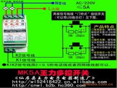 王力多控开关 简介《仙居县王力电子电器制造厂》自主开发、生产的“多控开关模块”,采用高新技术,用弱电控制强电,多地点控制照明灯,接线简单,使用方便安全。主要用于大、中、小学校、住宅楼、综合楼、写字楼、车间厂房、大型商场、银行、宾馆客房、别墅、公共走廊,地下汽车库、人防工程、部队工程娱乐场所、多地点控制照明灯和应急照明灯、控制工业设备电动机、控制电梯井道照明等。一、技术参数1.输入电压:220V AC、50HZ。2.输出电压:220V AC、50HZ。3.电源电压波动±15%。4.开关信号线电压:12V-24V DC(该电压可以直接提供给LED指示灯作为负载状态指示使用,所以指示灯线和开关信号线共用两根信号线即可,不必要使用4根线)。5.相应“王力多控开关”产品的额定负载是: ●MK1000王力多控开关是:1000W; ●MK5A王力多控开关是:5A; ●MK16A王力多控开关是:16A; ●MK30A王力多控开关是:30A; ●MK4P2A王力多控开关是:4极2A; ●MK4P16A王力多控开关是:4极16A ●MK2Y-5A多控开关带门控延时是:5A(用门磁开关控制的会延时自动关灯,用按钮开关控制的就不会延时自动关灯,还可以多地点控制) ●CK1开7关 王力场景控制器:配合“王力多控开关”才能使用,当按下控制按钮时,其中1路灯被强制打开,7路灯被强制关闭。 ●CK4开4关 王力场景控制器:配合“王力多控开关”才能使用,当按下控制按钮时,其中4路灯被强制打开,4路灯被强制关闭。 ●CK8开 王力场景控制器:配合“王力多控开关”才能使用,当按下控制按钮时,8路灯被强制打开。 (还有更多的产品型号及功能,详见 王力电子网站,或来电咨询:025-5241 8422)。二、接线与安装 1、一个照明回路,用一只“王力多控开关”模块。 2、“模块”输入交流电压220V AC,L接火线,N接零线。 3、“模块”输出交流电压220V AC,N接零线,L出与灯或用电器连接。 4、“模块”输入(N)、输出(N)零线直通,与电箱内的零线排连接。 5、“模块”的开关信号线输出直流电压12V-24V DC,开关信号线不需另外提供电源,同时还能带动LED指示灯(注意:该指示灯要串47K或100K的电阻)。二根“开关信号线”接在常开的复位按钮上,常开复位按钮(门铃按钮开关)之间并联接线。《本厂有配套的按钮开关:C86薄膜面板,一个面板上有单键,2键,3键,4键,最多的有12键,每个按键上都有LED指示灯》 6、电箱内多只“模块”上的开关信号线,要一路一路分开,接到各自对应的常开复位按钮(门铃按开关)上。 7、安装:“模块”安装在电箱内,安装方便,采用通用DIN导轨安装,86型暗盒内。三,产品特点 ①使用安全:操作的按钮开关是12-24V弱电信号,就是把按钮开关放在水中照样能开能关,还不怕潮湿触电。 ②操作方便:2根信号线可以并接多个按钮开关,可以在不同的地点都可以控制这个负载。 ③状态指示一目了然:每个按钮开关都可以带LED状态指示灯。 ④接线简单,又省钱:开关信号和LED状态指示灯是共用2根线的(不要4根线)。●仙居县王力电子电器制造厂●中国公认品牌:王力电子●电话:025-52418422●阿里巴巴诚信通:http//wl52418422.cn.alibaba.com●慧聪网商铺:http//cnwl.b2b.hc360.com
