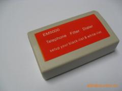 日常生活和工作中,常常会有一些陌生或者骚扰电话打进来以及一堆的垃圾传真,让你的电话铃声响起或浪费您大量的传真纸,造成您极度的烦恼和困扰,因为有一些电话是您不想接听的,但有些电话又是您想接听的。您也无法判断哪些传进来的是垃圾传真。EM5000产品就为你解决这些烦恼,让你不想接听的电话的铃声不会响起而又能看到来电号码,同时想接听的电话可以打进来并响铃,让您的传真机不再浪费您的资源,拒绝垃圾传真传进来,让您告别垃圾传真的时代。EM5000支持用户设定您通讯录中的黑名单和白名单,您S心所欲接和接收真。一.名词解释1.黑名单当产品检测到是黑名单来电时,把来电号码送给话机然后挂断外线,不在黑名单中的号码则按正常送来电号码和响铃。2.白名单当产品检测到是白名单来电时,按正常送来电号码和响铃,不在白名单中的号码包括空号码则当黑名单处理。3.本地区码当设定了本地区码后,您设定黑名单和白名单时就省去了号码前加本地区码的麻烦,****:本产品设定白名单时黑名单无效,设定黑名单时白名单无效。****:本产品白名单黑名单可以设置120组16位电话号码。