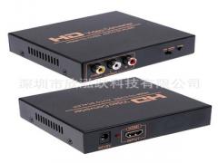 HDMI转AV信号转换器,可将HDMI数字信号转换为AV(CVBS)复合视频信号及FL/FR立体声音频信号,让客户将高画质的HDMI影音信号转换成为普通的电视、VHS绿放影机,DVD录放机等可接收CVBS信号(标准解析度480i,576i,)支持NTSC/PAL两种不同的制式.产品功能:1.将HDMI高清信号经过SCALE DOWN视频处理转换576I、480I(PAL/NTSC)的视频信号输出;2. ZOOM缩放功能,将输出的CVBS强制所需要的画面,不要超出电视机显示屏边缘;(详细介绍请参考附图介绍)3.自动识别HDCP,将前端HDMI所带的KEY(HDCP)强制解除;4.将HDMI数字音频,经过DAC数模芯片处理转成AUDIO模拟立体声;5.采用最先进的视频处理技术,对图像的亮度,对比度及色彩进行增强处理;6.经过转换后的CVBS效果透亮度十足(不像前一代HDMI转CVBS的CVBS信号有朦胧感)7. AV输出4:3、16:9切换输出,真实还原了4:3的画面经过转换后,在16:9电视机上严重压扁现像1)硬件转换,即插即用,无需任何软件驱动2)兼容HDMI1.33)支持NTSC与PAL两种制式输出4)一组HDMI输入;一组AV输出;一组立体声输出;A.输入端子:--------------HDMI x 1路输入;B.视频输出端子:------------VIDEO x 1 路输出C.模拟音频输出端子---------L/R x 1 路输出5) HDMI输入格式:480P,576P,720P,1080I,1080P@60Hz同时兼容DVI模式:800x600,1024x768,1280x720,1280x1024,1920x1080/@60hz等几种模式AV视频输出:480I、576I(可选)音频输出:左右声道(L/R)外观尺寸:100mm(W)x105mm(D)x 25mm(H)3、应用平台:1) KTV梦工厂将高清的HDMI信号,接入点歌系统,转换后得到普通的AV信号,便于传输出接到各小电视2)重要会议系统,可作展示平台将高清摄像机摄像后的高清HDMI信号经过转换器转换后,再经过采集卡采集到电脑系统,便于异地远程会议传输3)民用级别行业:驳接高清播放器,DVD,机顶盒,及PS3,XBOX360 蓝光机等,经过转换后连接到普通电视的AV接口观看