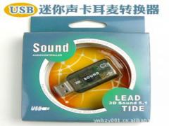 如果您的声卡坏了,无需更换主板,就来一个USB声卡就解决喽!USB声卡,环绕立体声.5.1声道.兼容USB2.0纯数位音效输出,虚拟5.1声道处理能力支持普通的音箱或者耳机,带麦克风孔;USB接口,取代传统声卡;外型酷似闪盘,黑色外壳,简单的USB接口装置,即插即用。假如您的主板上的声卡有问题,您是否需要更换或添加一块声卡呢?且慢,请考虑一下本声卡,本店的这款USB声卡是全球最小的USB声卡,具有和CD媲美的音质,安装在机箱外从而杜绝了机箱内部的电磁干扰,使音质更加纯正。 支持2声道模拟5.1声道;大功率:可推动各种高阻耳机、普通耳机和音响,音质太棒了,信噪比实测可达到90分贝。在WIN2000、WINXP、WIN2003系统中不需要安装驱动程序,操作简单化只要接上耳机或是喇叭,美妙的音乐立即可以欣赏到了!!小巧的体积,方便携带。兼容USB2.0 纯数位音效输出,虚拟5.1声道处理能力