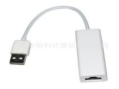 USB2.0网卡 USB2.0转RJ45产品规格:1.接口类型:USB 2.0 Full Speed2.支持协议:IEEE 802.3u标准3.工作频率:48MHz/125MHz4. 工作温度:-25℃~+70℃5. 连接速率:10M/100Mbps6. 存储温度: -40~85℃7. 相对湿度: 10%~80%(无凝结)8. 工作电压: 4.2-5.5V9. 主体尺寸: 68*21.3*19.2(mm)10. 传输速率:实际传输速率依服务商状况而定,最大800Kbps11.电源功率:1W12.工作电流:180MA/5V13.操作系统:支持Windows98/ME/2000/2003/XP/Vista/Linux/Win CE产品特色:1.外形小巧美观,直插式免拆机;2.支持热拔插,工作状态灯显示;3.产品稳定性好,速度快,质量高,优化电源管理,低耗电量。4.产品体积:67.7*21.4*19.6MM包材规格:1.外箱尺寸( 200pcs): 57.2 × 38.7 ×36.5 mm2.包装盒尺寸: 12 × 11 ×2.35 mm3.驱动光盘一张 4.装箱单一份 5.单个产品(含包装)重量:43.7G 6.整箱重量:9.2KG安装说明:1.首先运行光盘里的文件夹的可执行程序:USB 1.1 LAN Driver-->rs9600 Driver-->WindowsXP2003-->SETUP.EXE2.插上USB网卡,自动安装驱动.