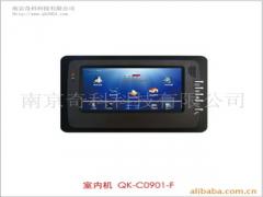 产品型号:QK-C0901-F户户通话;来电显示;家居安防:安防模式设置,安防探头设置,报警记录查询。铃声设置,界面背景设置。小区服务:个人信息和公共信息,支持文字与图片信息发布。视频监控:可循环监视围墙门口机,别墅门口机,单元门口机留影留言;免打扰功能房号设置,安防探头根据用户需求自定义。显示屏尺寸:7inch (16:9)TFT-LCD解晰度:16位色高清显示屏(800×480)操作方式:触摸式防区数量:8个网络:三层局域网,100M以太网。电气性能:输入电压12~15V动态功率< 5W(工作模式)静态功率<1.5W(待机模式)CPU:高性能专用DSP,主频-400MHz;flash-4MB;RAM—32MB;